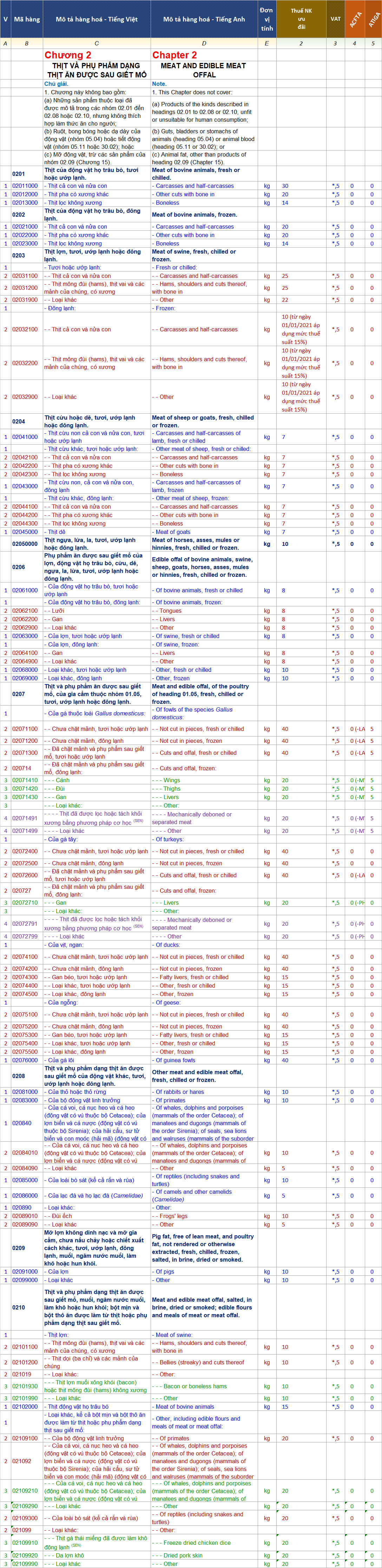 mã hs code và thuế suất nhập khẩu thịt đông lạnh các loại